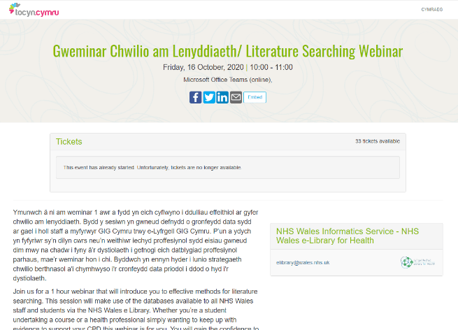 The NHS Wales e-Library for Health provided the coordination of the webinars and the engagement campaign. The campaign focused on two key areas: raising awareness of the training provided by NHSWLKS and creating e-resources that can be reused. First, three meetings were created on MS Teams, and the e-Library, as organiser of the meetings agreed to provide the “house-keeping” of the webinars. We created a route for registration on a free platform called Tocyn.Cymru, which is an online platform that can be used to promote events. This allowed all authorised users to be able to register in the public domain. All those registered were then added to the meeting invitation.