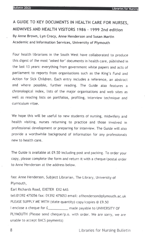 A guide to key documents in health care for nurses midwives and health visitors 1986 to 1999 2nd edition Libraries for Nursing Bulletin Vol. 20 (2) Anne Brown, Lyn Crecy, Anne Henderson, Susan MartinUniversity of Plymouth PDFDownload Share this: Click to share on X (Opens in new window) X Click to share on Facebook (Opens in new window) Facebook Like Loading...
