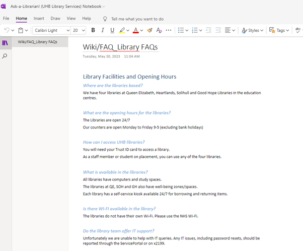 Once we felt confident with the range of Microsoft products we had access to, we then created a channel called ‘UHB Library Services’ in late 2022 and added different sections where our users could find out information about the library service 24/7. We used the following: