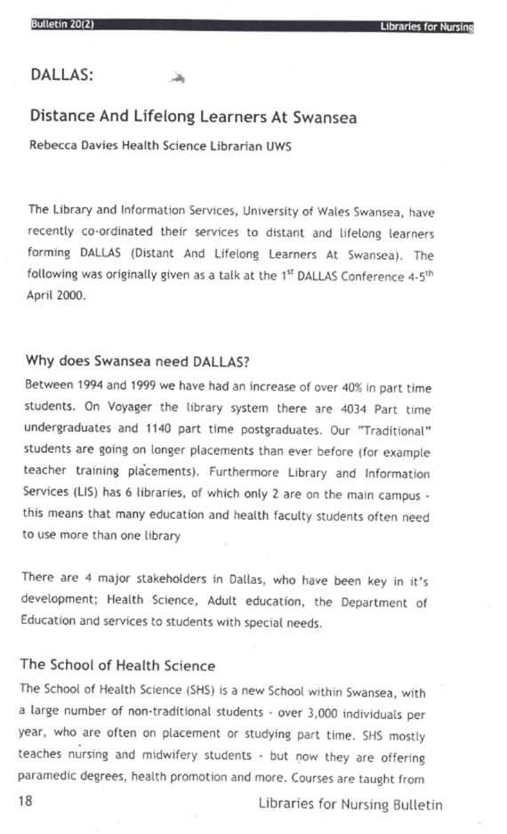 Dallas distance and lifelong learners at Swansea Libraries for Nursing Bulletin Vol. 20 (2) PDFDownload Rebecca DaviesHealth Science LibrarianUWS Share this: Click to share on X (Opens in new window) X Click to share on Facebook (Opens in new window) Facebook Like Loading...