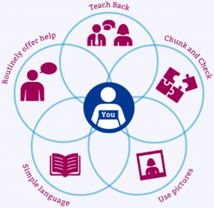 We can encourage health professionals to ensure that the language they use with patients is simple and easy to understand, as well as introducing concepts such as “Teach Back” and “Chunk and Check“, which they can use with patients to ensure they understand what the health professional has told them.