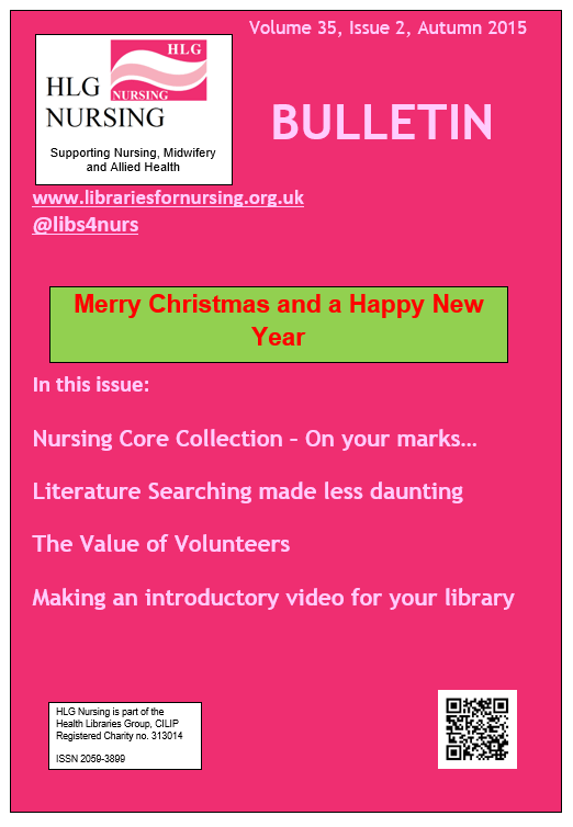 HLG Nursing Bulletin Vol 35(2) Editorial4Compiling the new edition of the Nursing Core CollectionMargaret Scarce7Writing for the British Journal of Midwifery – how I tried to make literature searching approachable to professional midwivesGillian Siddall and Alison Power11The Value of Volunteers – starting a volunteer program in an NHS LibrarySarah Hennessy17“Welcome to the Medical Library”: Producing an introductory video for a multi-site library servicePhillip Barlow19 Share this: Click to share on X (Opens in new window) X Click to share on Facebook (Opens in new window) Facebook Like Loading...
