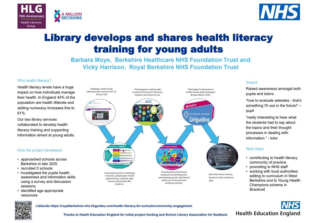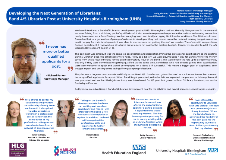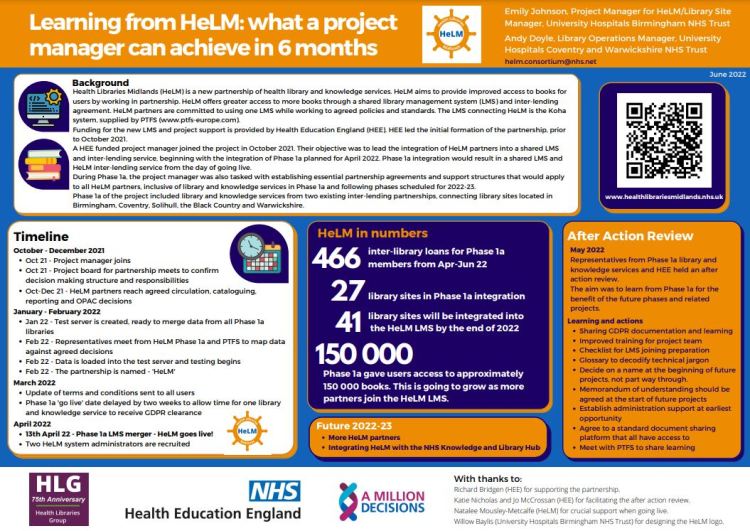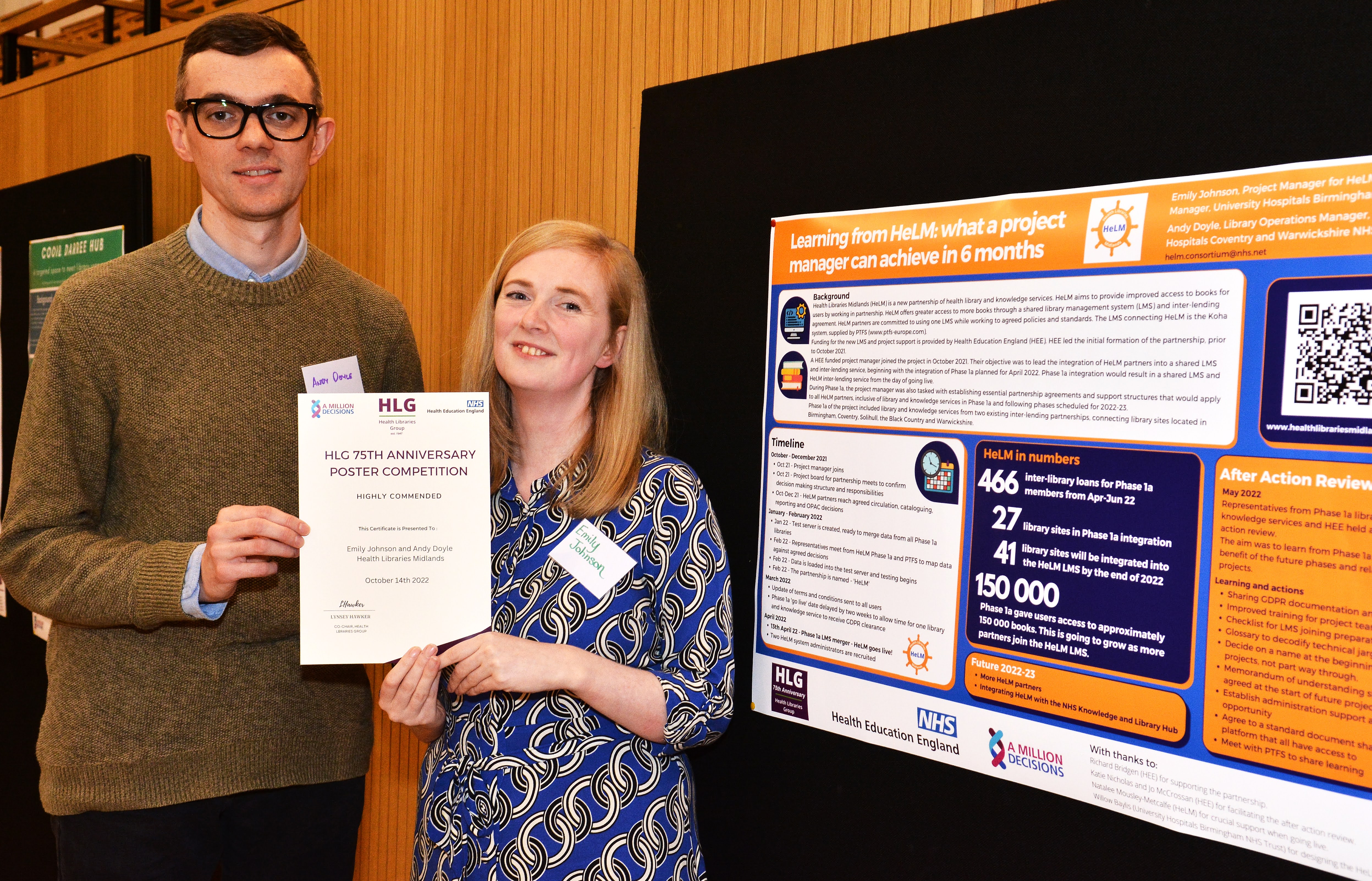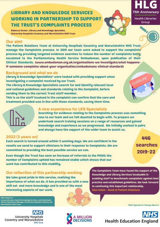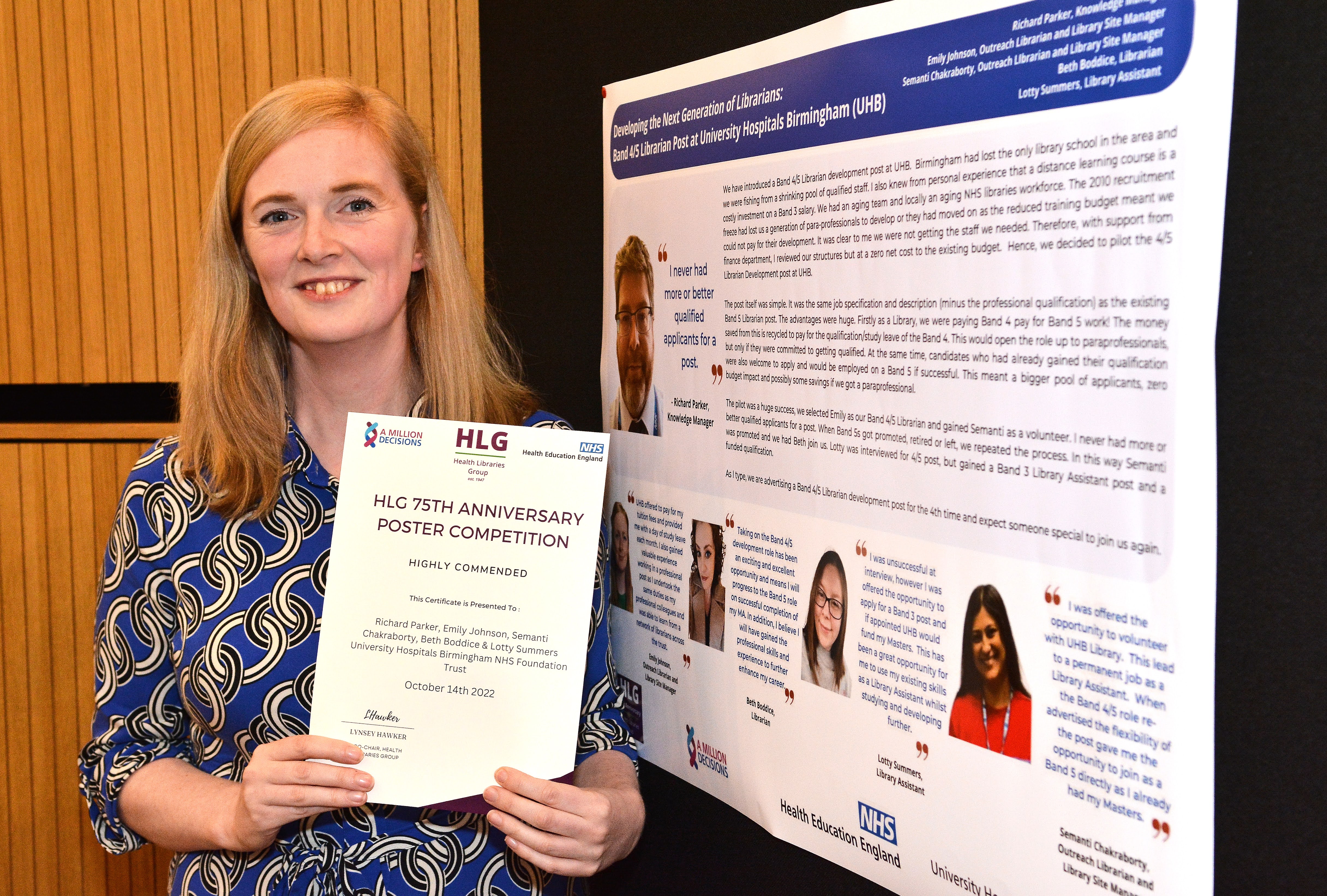 To celebrate HLG’s 75th anniversary, we teamed up with our colleagues at Health Education England to invite you to produce a poster. We received many brilliant entries that made it hard to judge those that would be successful in the competition – you can see a selection of them on the carousel below, while all of them are listed further down the page. In addition, you can see the attached lightning talks from each of the winners at the bottom of the page.