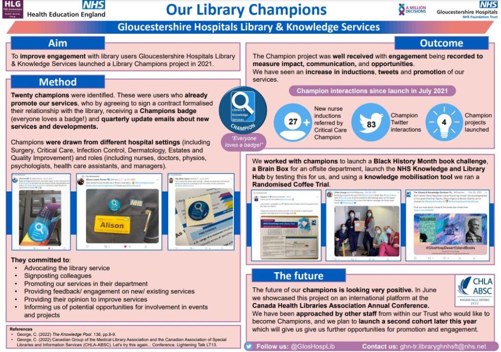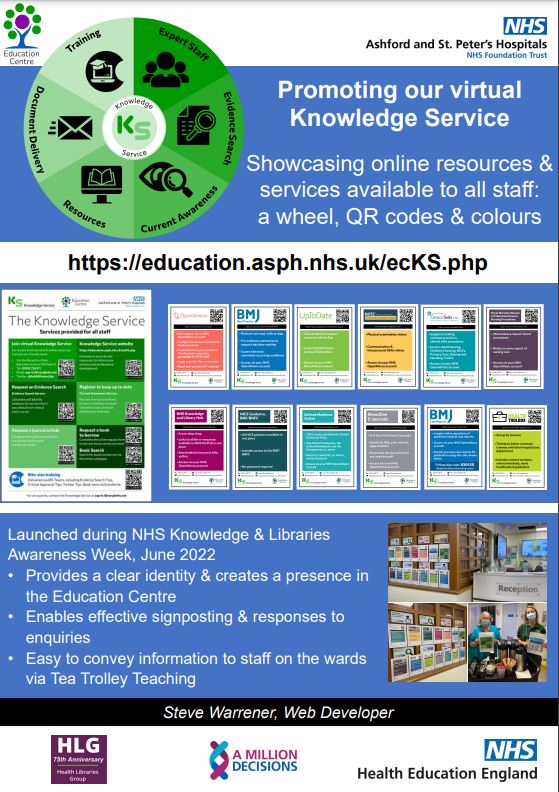 As part of this initiative, we have collectively demonstrated and promoted the skills, roles and positive impact of health librarians and knowledge specialists in supporting key health and care agendas. The poster competition was an opportunity for you to share more of your great impact.