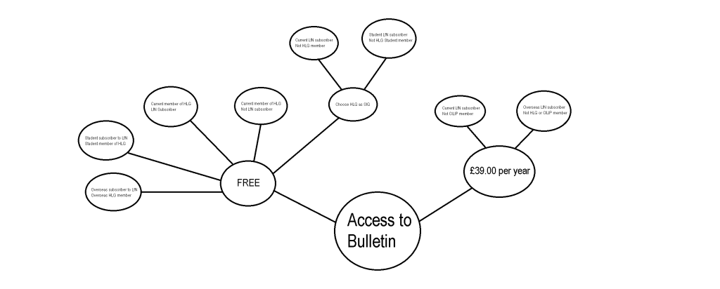 For those that have subscribed to LfN, the fact that it will no longer be a separate sub-group means you will no longer have to pay the additional subscription cost; if you are already a member of HLG, then access to the Bulletin will form part of your overall access to HLG’s resources. If you aren’t a member of HLG but are a member of CILIP, then you can get access to the Bulletin, plus all of the other benefits, by making HLG one of your two chosen SIGs. If you aren’t a member of CILIP, you can still join HLG and get access to all of HLG’s resources and services as a non-CILIP member. The change also means that those members of HLG that have never subscribed to LfN before will now have access to the Bulletin. Fig. 1 shows how the different categories of member will be able to access the Bulletin in its new form.