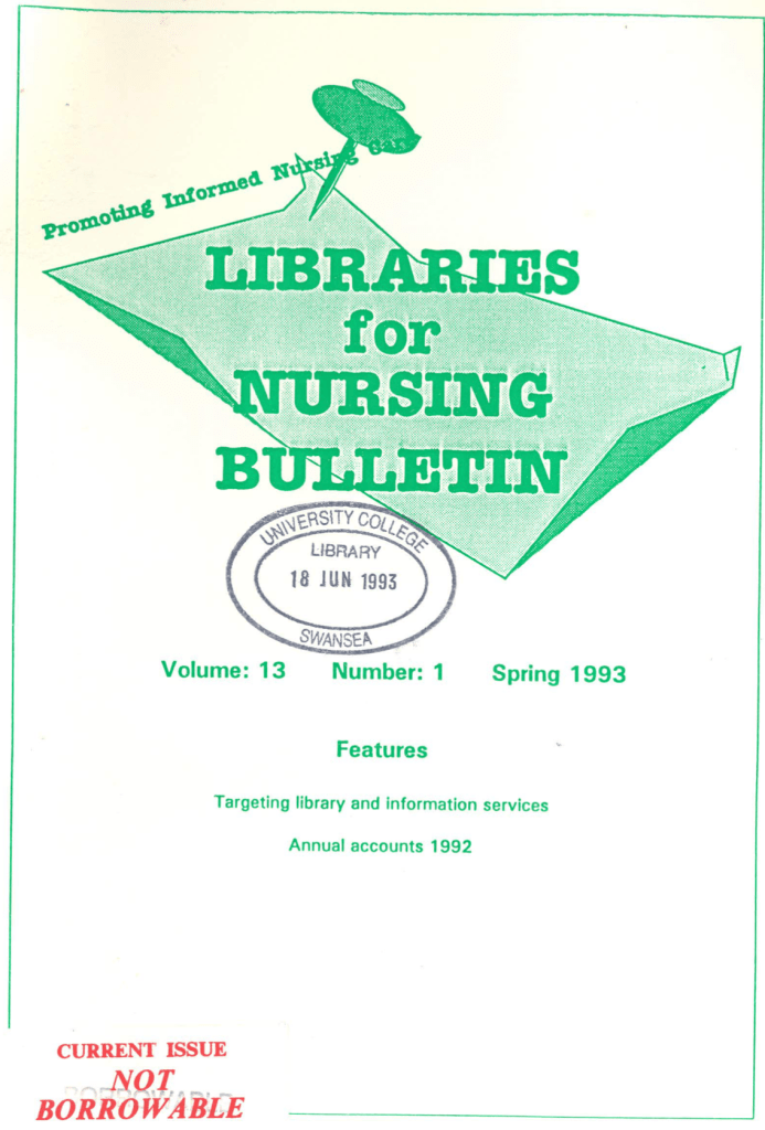 Libraries for Nursing Bulletin Vol 13(1) Spring 1993 ContentsCommitteeChairman’s CommentsTony ShepherdTargeting Library and Information Services – Strategy for the FutureDr Philip CheungENB Awarded General Nursing Council Trust Grant to Commission NURLIS II ProjectBook ReviewsLibraries for Nursing – Spring Study Day 1993LA Medical, Health & Welfare Libraries Group – Spring Lecture SeriesENB National Annual Conferences – Mental Health Nursing 19931993 European Year of Old PeopleTraining EventsLibrary Association, Medical Health and Welfare Libraries Group Nursing Information Sub-Group – income and expenditure for the year ended 31st December 1992 Share this: Click to share on X (Opens in new window) X Click to share on Facebook (Opens in new window) Facebook Like Loading...