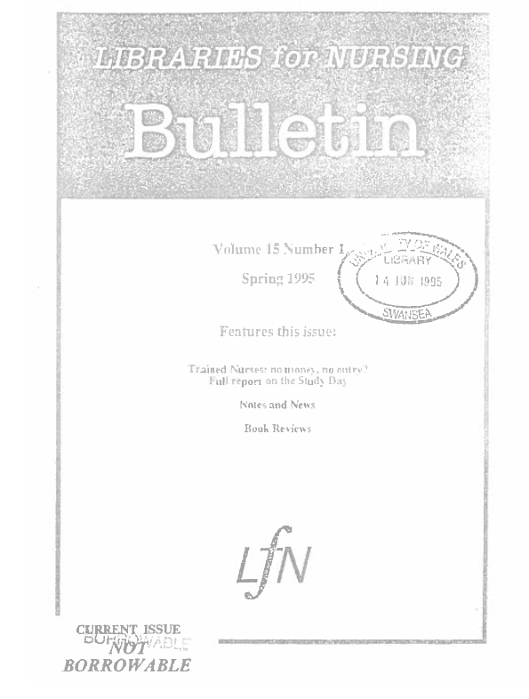 | Libraries for Nursing Winter Study Day 1994: Trained Nurses: No Money – No Entry? Deirdre Griffin, Louise Proctor, Christine Pinder and Simon Beard | 15 |