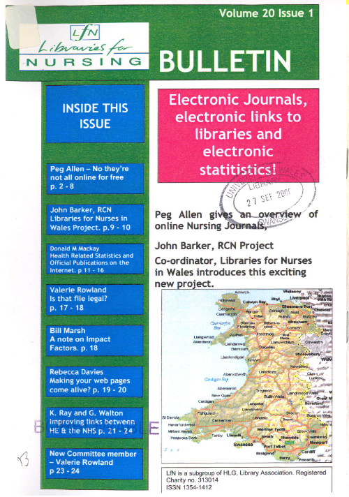 Libraries For Nursing Bulletin Vol 20(1) NMAHP – The UK’s Gateway t High Quality Internet Resources for Nurses, Midwives and Allied Health Professions2NMAHP and OMNIRod Ward and Lisa Gray4Nursing Union List of Journals – The Robin Hood of the Inter-Library Loan World?Humphrey Dunn24“Would you like to go to Gibraltar?”Val Rowland27 Share this: Click to share on X (Opens in new window) X Click to share on Facebook (Opens in new window) Facebook Like Loading...
