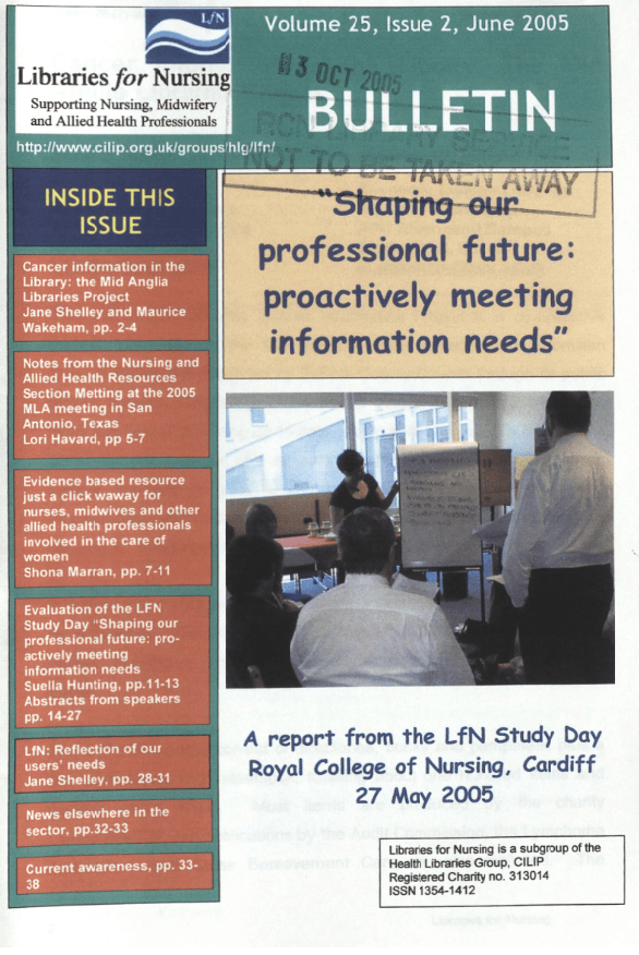 Libraries for Nursing Bulletin Vol 25(2) Cancer Information in the Library: The Mid-Anglia Libraries ProjectJane Shelley and Maurice Wakeham2Notes from the Nursing and Allied Health Resources Section MeetingMLA Meeting, San Antonio, 14-19 May 2005Lori Havard5Evidence-Based Resources Just A Click Away for Nurses, Midwives and other Allied Health Professionals Involved in the Care of WomenShona Marran7“Shaping Our Professional Future: Pro-Actively Meeting Information Needs”LfN Study Day, RCN Cardiff, 27 May 2005Suella Hunting11LfN Study Day abstracts14LfN: Reflection of Our Users’ NeedsJane Shelley28News32Current Awareness33 Share this: Click to share on X (Opens in new window) X Click to share on Facebook (Opens in new window) Facebook Like Loading...