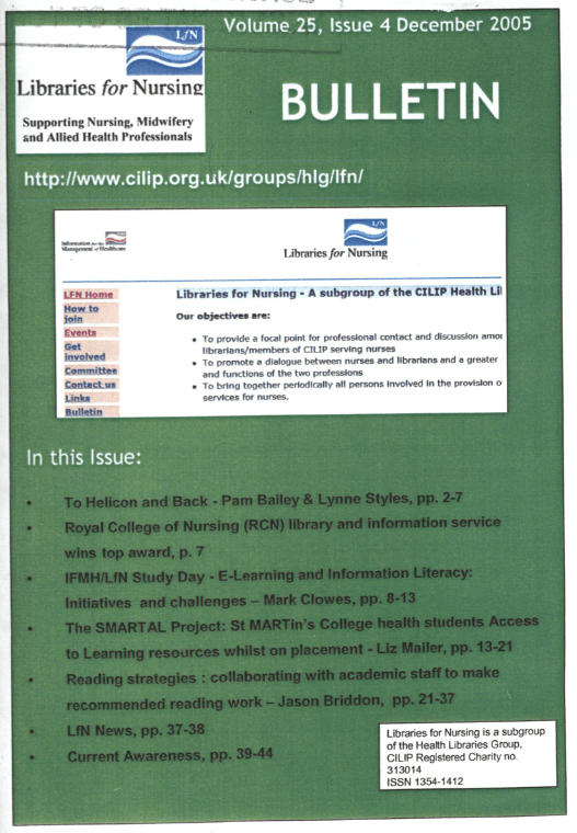Libraries for Nursing Bulletin Vol 25(4) To Helicon and BackPam Bailey and Lynne Styles2Royal College of Nursing (RCN) Library and Information Service wins Top Award7E-Learning and Information Literacy: Initiatives and ChallengesIFMH / LfN Study Day, Leeds 14 November 2005Mark Clowes8The SMARTAL Project: St MARTin’s College Health Students’ Access to Learning Resources Whilst on PlacementLiz Mailer13Reading Strategies: Collaborating with Academic Staff to Make Recommended Reading WorkJason Briddon21LfN News37Dates for your Diary, Useful Websites and Current Awareness39 Share this: Click to share on X (Opens in new window) X Click to share on Facebook (Opens in new window) Facebook Like Loading...