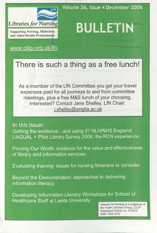 Libraries for Nursing Bulletin Vol 26(4) Editorial3Getting the Evidence…and Using It? NLH / NHS England LibQUAL + Pilot Library Survey 2006: The RCN ExperienceJudy Atkinson4Proving Our Worth: Evidence for the Value and Effectiveness of Library and Information ServicesLfN Study Day, RCN London, 24 November 2006Alison Taylor12Evaluating Training: Issues for Librarians to ConsiderAlison Brettle18Beyond the Demonstration: Approaches to Delivering Information LiteracyTricia Garvey24Developing Information Literacy Workshops for School of Healthcare Staff at Leeds UniversityAlison Lahlafi30Current Awareness35 Share this: Click to share on X (Opens in new window) X Click to share on Facebook (Opens in new window) Facebook Like Loading...