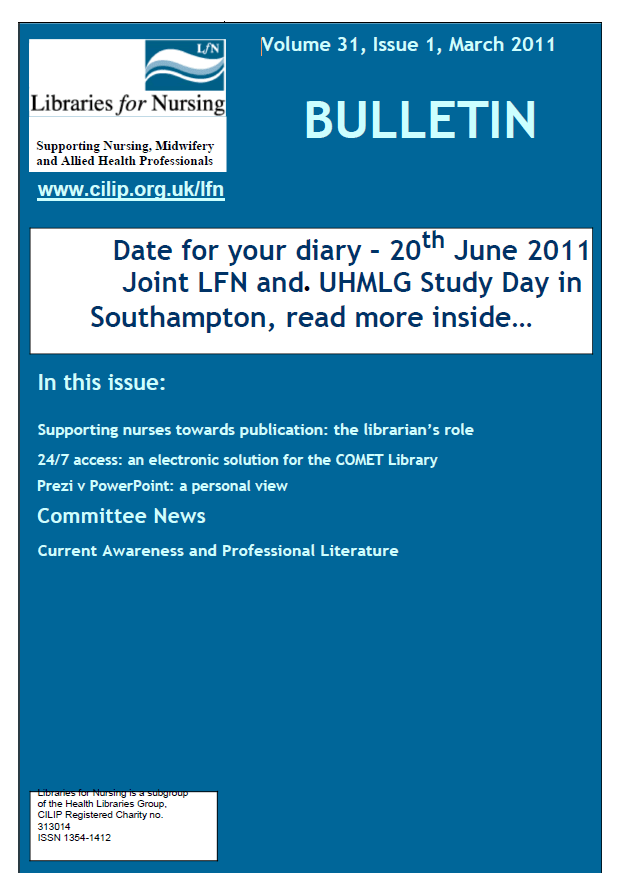 Libraries for Nursing Bulletin Vol 31(1) Editorial3Supporting nurses towards publication: the librarian’s role Tatjana Petrinic524/7 access: an electronic solution for the COMET Library Sally Bartlett16Prezi v PowerPoint: a personal view Phillip Barlow22Book review:Active learning techniques for librarians Sarah Kevill28Committee News: A Day in the Life of Bethan Carter30Current Awareness and Professional Literature33 Share this: Click to share on X (Opens in new window) X Click to share on Facebook (Opens in new window) Facebook Like Loading...