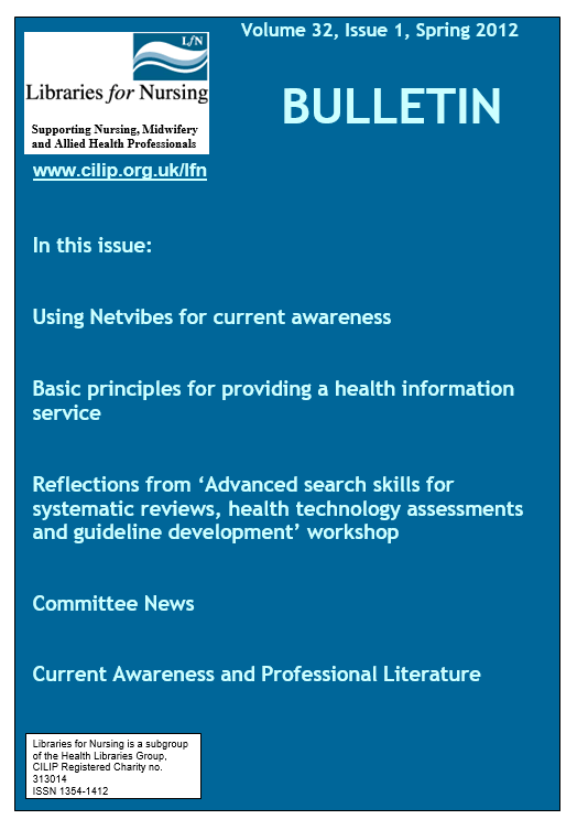 Libraries for Nursing Bulletin Vol 32(1) Editorial3Creating Knowledge Centre Information Portals with NetvibesJason Curtis5Basic Principles for Providing a Health Information ServicesSarah Thompson13Reflections from ‘Advanced search skills for systematic reviews, health technology assessments and guideline development’ workshopBethan Carter22Committee News– A Day in the Life of Andrew Dove– Committee Profiles29Current Awareness and Professional Literature33 Share this: Click to share on X (Opens in new window) X Click to share on Facebook (Opens in new window) Facebook Like Loading...