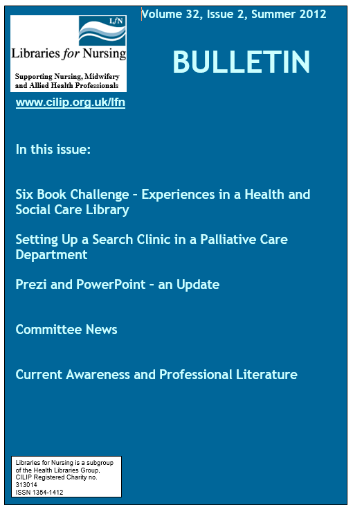 Libraries for Nursing Bulletin Vol 32(2) Editorial3Six Book Challenge – Early Experiences in a Health and Social Care LibraryJodie Knight5Setting up a Search Clinic in a Palliative Care DepartmentElinor Bastin11Prezi and Powerpoint: An UpdatePhillip Barlow18Committee News– A Day in the Life of Sophie Pattison22Current Awareness and Professional Literature25 Share this: Click to share on X (Opens in new window) X Click to share on Facebook (Opens in new window) Facebook Like Loading...
