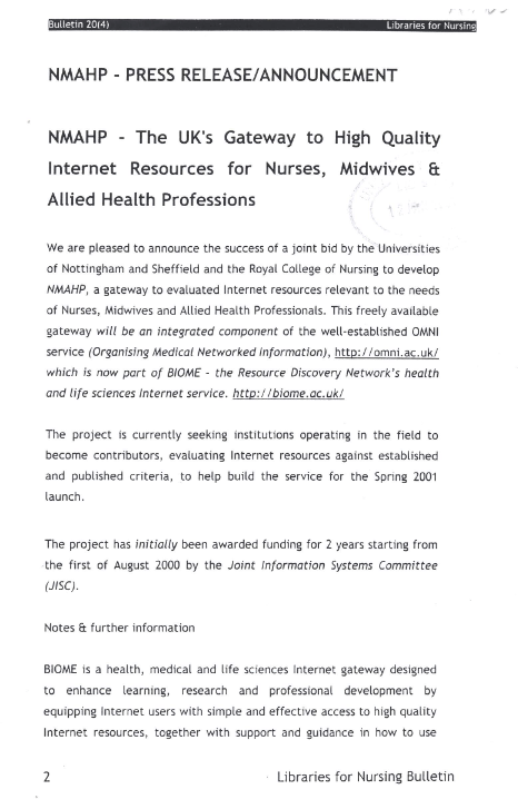 NMAHP – The UK’s Gateway to High Quality Internet Resources for Nurses, Midwives & Allied Health Professionals Libraries for Nursing Bulletin Vol. 20 (4) Universities of Nottingham & Sheffield PDFDownload Share this: Click to share on X (Opens in new window) X Click to share on Facebook (Opens in new window) Facebook Like Loading...