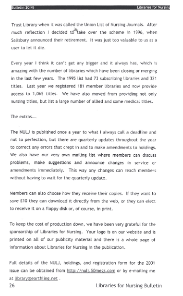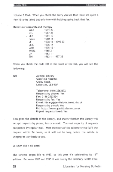 Nursing Union List of Journals – the Robin Hood or the interlibrary loan world? Libraries for Nursing Bulletin Vol. 20 (4) Humphrey DunnMedical LibrarianGlenfield Hospital PDFDownload Share this: Share on X (Opens in new window) X Share on Facebook (Opens in new window) Facebook Like Loading...