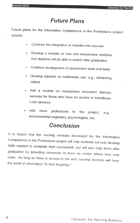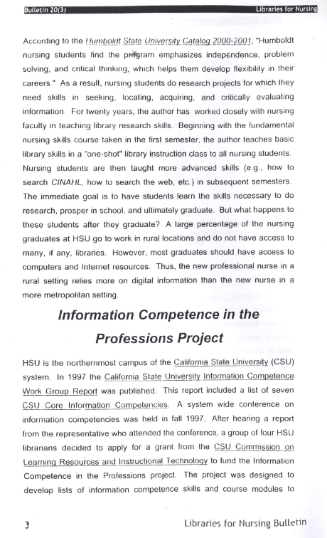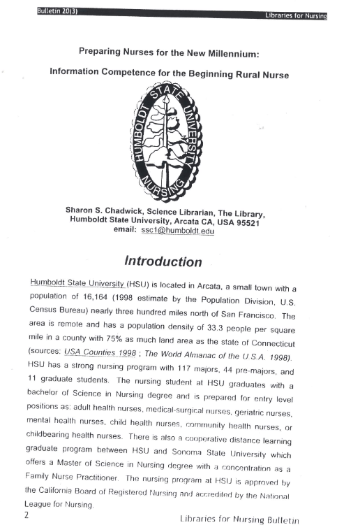 Preparing nurses for the new millenium information competence for the beginning rural nurse Libraries for Nursing Bulletin Vol. 20 (3) Sharon S ChadwickScience LibrarianHumbolt State University PDFDownload Share this: Click to share on X (Opens in new window) X Click to share on Facebook (Opens in new window) Facebook Like Loading...