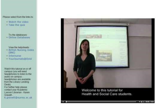 Gravett, K. 2010, ‘Using online video to promote database searching skills: the creation of a virtual tutorial for Health and Social Care students’, Conference slides, LILAC 2010. <http://www.lilacconference.com/dw/programme/Presentatio ns/Tuesday/Lecture_Theatre/Gravett_-_Using_online_video_presentation.pdf>