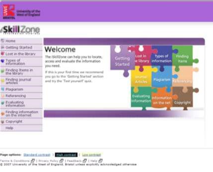 This online element also echoes the above point that such students ‘feel they could learn the material online any time’ (Sweeney 2005, p. 168) and being able to access training materials remotely and on demand was one of the benefits Gravett noted of using this technology. This accessibility was emphasized throughout LILAC with various presentations discussing the use of VLEs, such as James Bisset and Sarah Brain’s ‘How was it for you? Evaluating the iSkillZone’4 and ‘Interactive Learning using Xerte: minding the skills gap’ by Wendy Stanton and Jenny Coombs,5 to gather training materials in one place. Below is a screen grab of the iSkillZone homepage on the University of the West of England Library web pages: