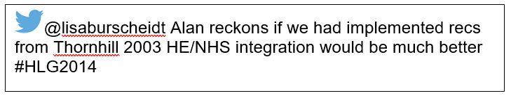 The Health Libraries Group conference was not merely the first conference I had attended in a long time; it was also the first conference that I was able to tweet at. (The two are not unconnected – I don’t think that Twitter existed when I last went to a conference!)