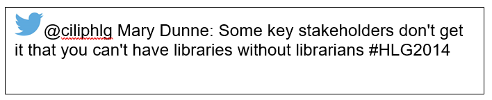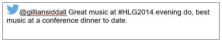 I am quite sure that it was a bit disconcerting for the speakers to see so many people with their heads down looking at a variety of mobile devices (I don’t think that I saw even one laptop, unless it was on a conference stand!). I do wonder what the speakers thought of that, knowing that people were either simply compiling notes or were perhaps tweeting their words as soon as they were spoken. I don’t know if it has a direct impact on presentations, perhaps it didn’t. I am aware that at some conferences there is a projection of live tweets on a nearby screen – I did ask whether that would happen at #HLG2014 but was told that financial constraints prohibited it. But it would have been rather fun to see live tweeting available for all to see, although it is quite possible that although it may have engendered more twitter conversations, it would likely have quite changed the tone of the conference as people may have ended up focusing on the live tweets instead of the speaker, and would probably require some flexibility on the part of the speaker to respond to any comments there and then.