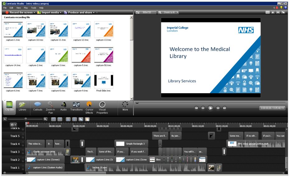 The subscription to Camtasia was secured in September 2014 (Sandhu, 2015), with training in its use provided in January 2015, after which the Medicine team set out to come up with ideas for our own videos, aimed at the service provided to the NHS. At first, these covered brief instructional videos, primarily around the use of OpenAthens. At time of writing, there were three of these posted on the library website (hosted on YouTube), detailing various aspects of OpenAthens registration (Imperial College London, 2015), as well as more specific instructions on how NHS users can access some of the library’s resources remotely. However, the nature of the library service – multiple sites supporting different trusts, with all NHS employees of those trusts eligible to use all libraries – led to the idea of producing an introductory video, which was less instructional and more “inductional”, incorporating a good deal of the basic information about the library and the service that is given to NHS users at induction sessions.